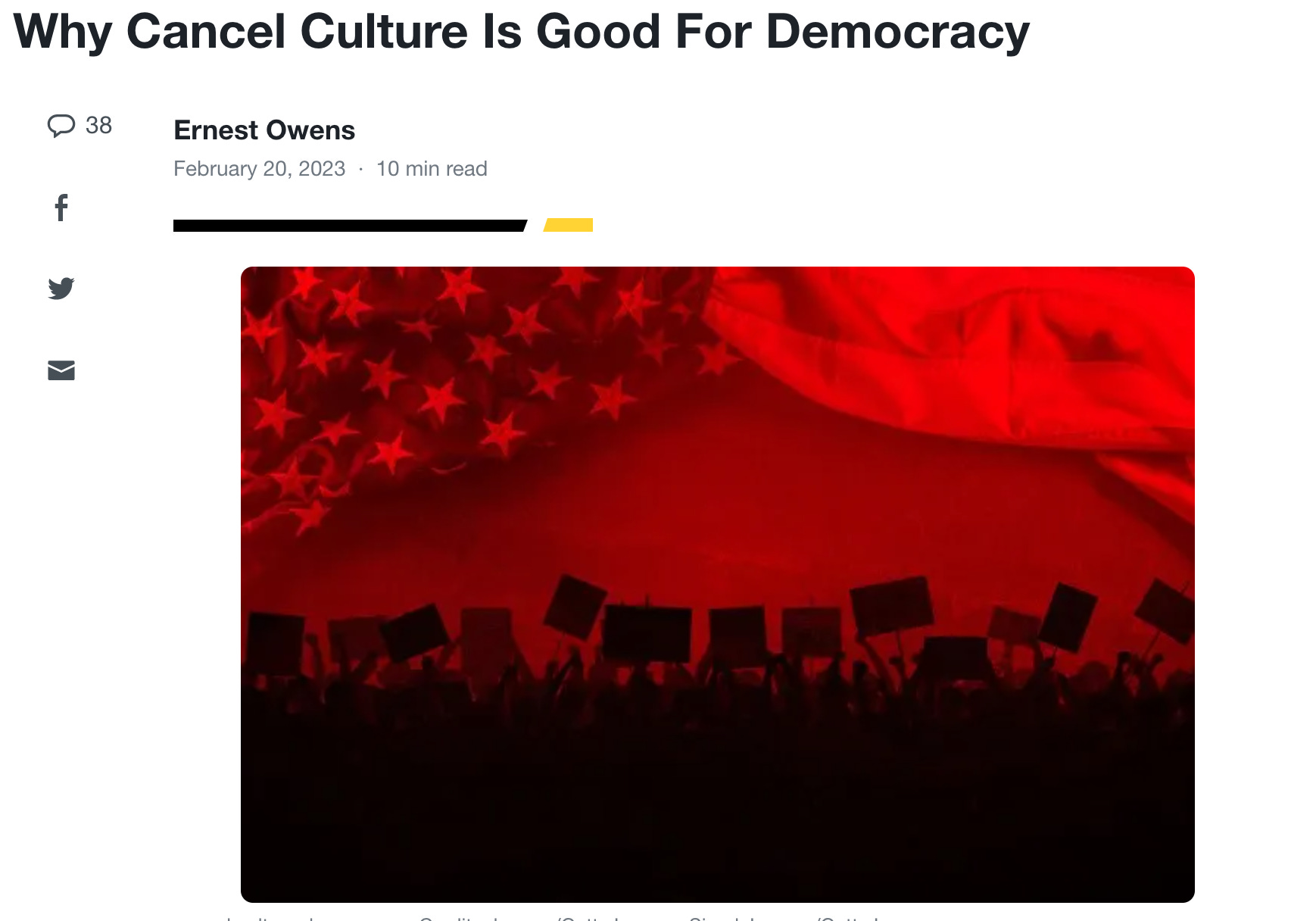 Cancel Culture probably is, in fact, good for Democracy...and any given democracy – however, it is bad, particularly so, for a constitutional republic. This is because democracy is merely mob-rule cloaked in parliamentary procedure to give it an appearance, an air of legitimacy, whereas a constitutional republic preserves the rights of individuals who may be in the minority.