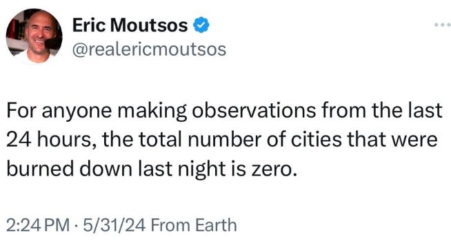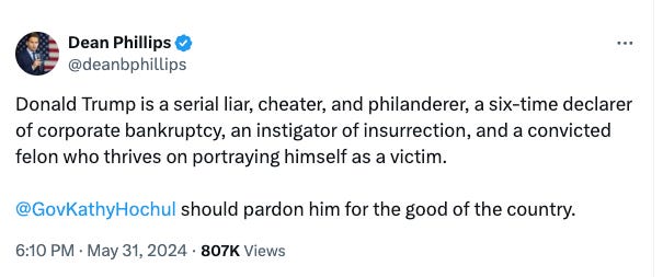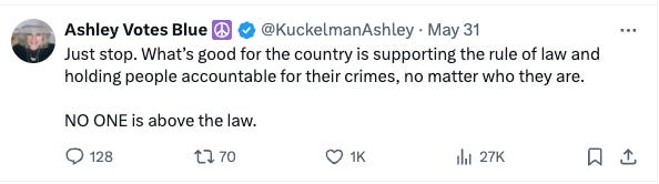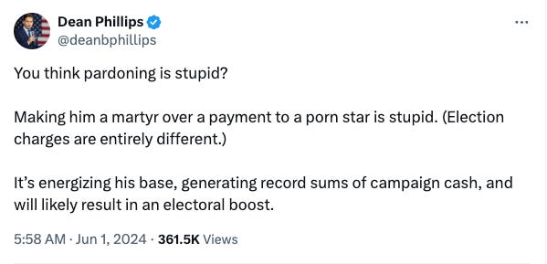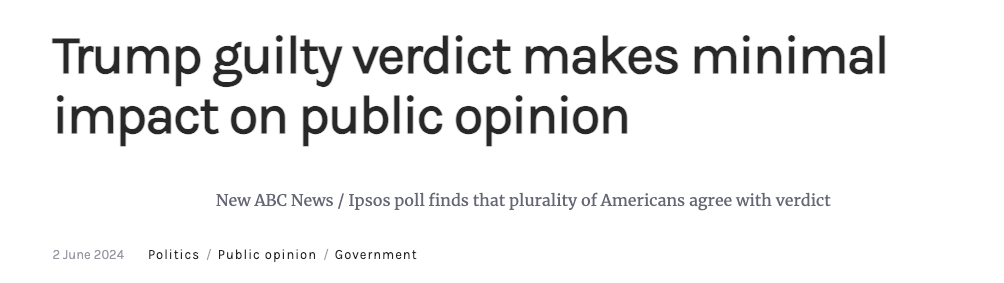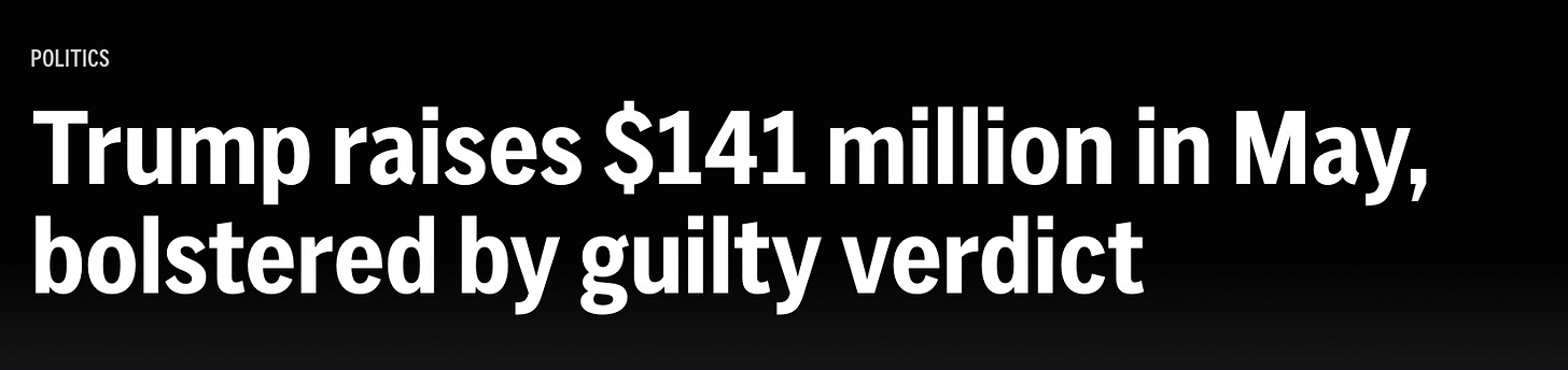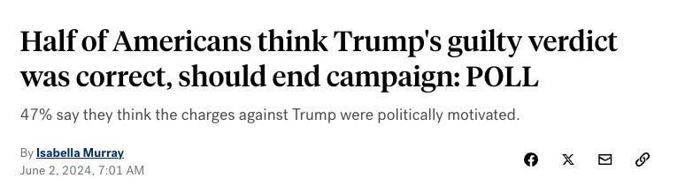 My best response to it is “almost no one cares”. ..about any of it. Let me make my point. Yesterday I worked out early with my daughter. She doesn’t count because she wouldn’t care about anything that happened to Trump. Then I went to the club where I can use walking track, whirlpool, steam, etc. No one was talking about the verdict. It’s filled with seniors and I didn’t even see a Trump tshirt. I then went to the music facility we’re starting and interacted with parents bringing their kids to practice. Nothing. I worked with my son in law on one of the jet skis last night and spoke with many of my neighbors. No one mentioned anything about the trial. I’ve been at the lake all week. No one there has said a thing. Outside of the social media sphere, and Substack, no one cares.
