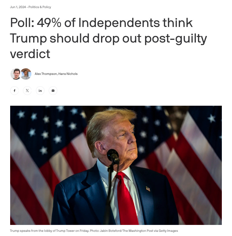 49% of Independents and 15% of Republicans said Trump should end his campaign because of the conviction.